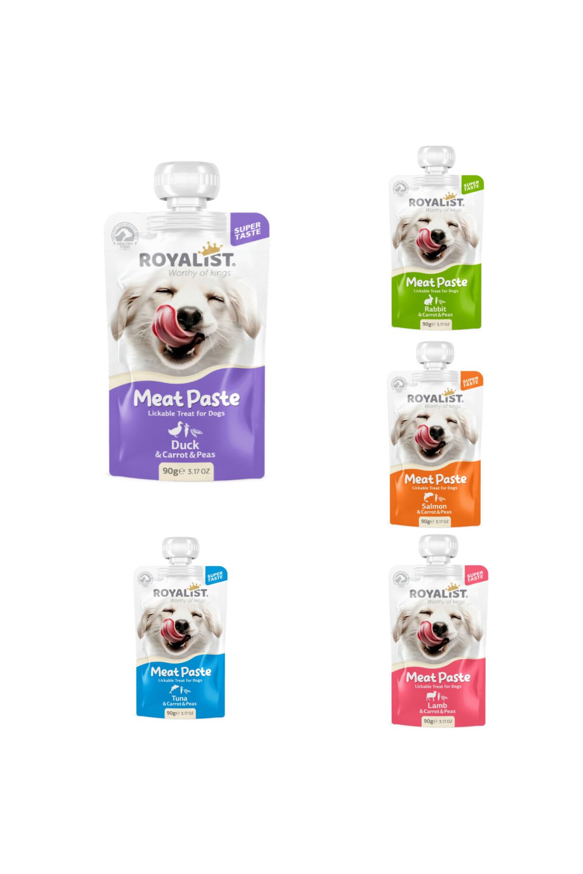 Royalist Meat Dog Paste 5’li Set 90 GR Köpeğinizin beğeneceği 5 farklı lezzet bir arada! Royalist Meat Dog Paste 5’li Set, somon, tavşan, kuzu, ördek ve ton balığı gibi çeşitli tatlarla hazırlanmış özel formülleriyle köpeğinizin her öğünde farklı bir lezzet deneyimi yaşamasını sağlar. Set İçeriği: Somon & Havuç & BezelyeTavşan & Havuç & BezelyeKuzu & Havuç & BezelyeÖrdek & Havuç & BezelyeTon Balığı & Havuç & BezelyeBesleyici ve Sağlıklı: Her lezzet, vitamin, mineral ve yüksek protein içeriğiyle zenginleştirilmiştir.Pratik Kullanım: Kolay sıkılabilir 90 gr tüpler; ödül maması olarak ya da yemeklere ekleyerek kullanılabilir.Her Irk için Uygun: Küçük, orta ve büyük ırk köpeklerin tüketimine uygundur.Ekonomik ve Çeşitli: 5 farklı lezzet bir arada, köpeğinizin damak zevkine hitap eder.Royalist Meat Dog Paste 5’li Set, köpeğinizin hem sağlığını destkler hem de ona lezzetli bir ödül sunar. Eğitim süreçlerinde ya da günlük öğünlerine farklı tatlar katmak için mükemmel bir tercihtir. Hemen sipariş verin, köpeğinizin favori lezzetlerini deneyimlemesine olanak tanıyın!